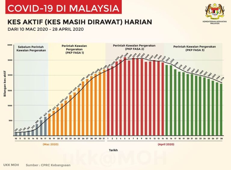 Dengan peningkatan kes sembuh dan discaj #COVID19 menjadikan jumlah kes aktif semakin menurun sepanjang PKP Fasa 3 sekali gus berjaya meratakan lengkungan graf (flattening of the curve) dan negara kini memasuki fasa pemulihan. #StayatHome#KitaJagaKita#StrongerTogether#KitaMestiMenang#COVID19Malaysia