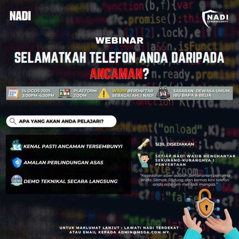 TARIKH : 14 OGOS 2025 MASA : 3.00 – 4.30 PETANG PESERTA : AHLI NADI FELDA NENERING 1 TEMPAT : NADI FELDA NENERING 1 Tujuan:Selamatkah Telefon Anda Daripada Ancaman? Webinar ini adalah bertujuan untuk meningkatkan kesedaran dan kefahaman peserta mengenai […]