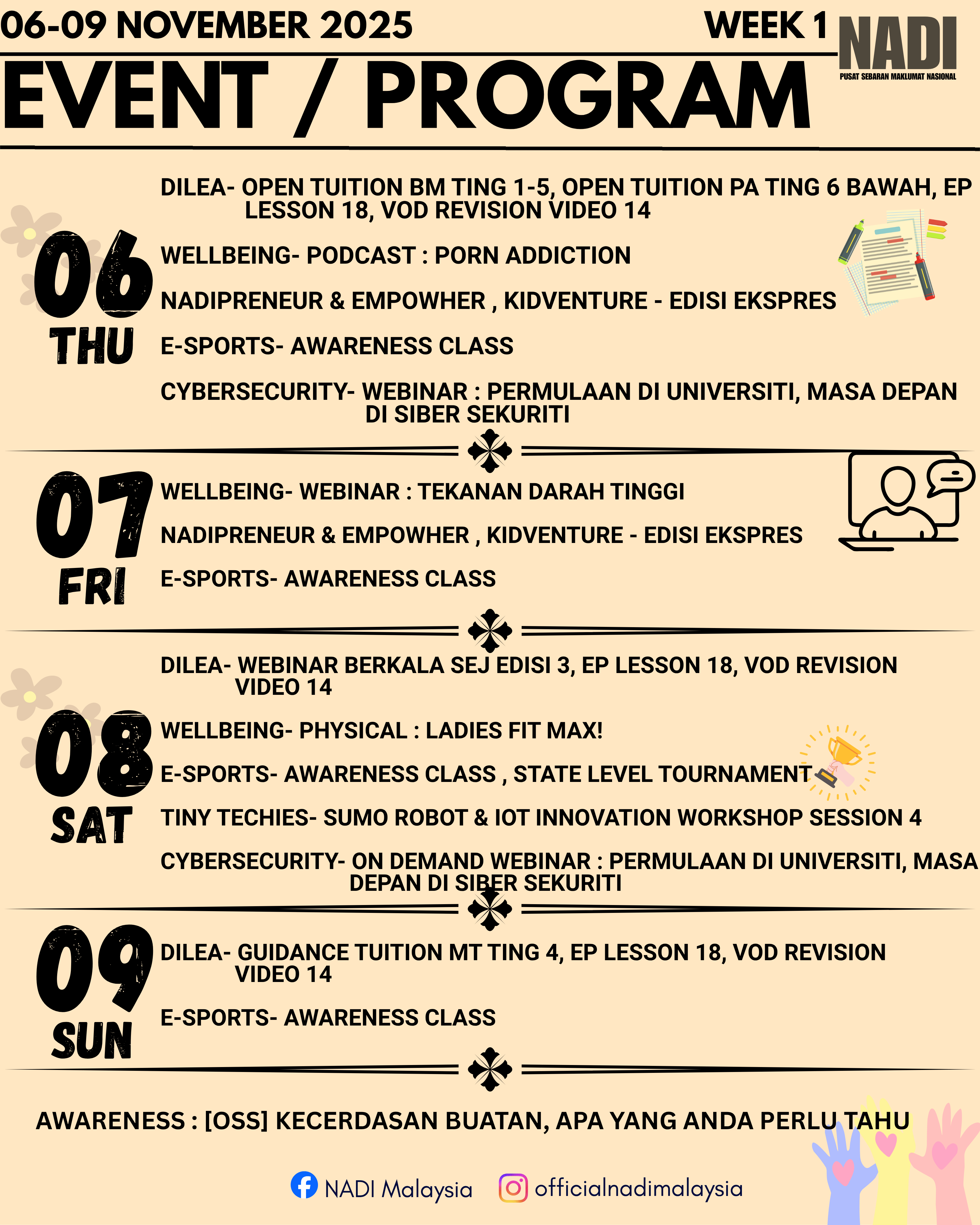 TARIKH : 8 NOVEMBER 2025 MASA : 10.00 – 11.00 PAGI PESERTA : KOMUNITI FELDA NENERING 1 TEMPAT : NADI FELDA NENERING 1 Tujuan :memperkenalkan dan mengasah kemahiran teknologi, robotik, dan pemikiran kritis dalam kalangan peserta muda. Inisiatif ini menekankan […]